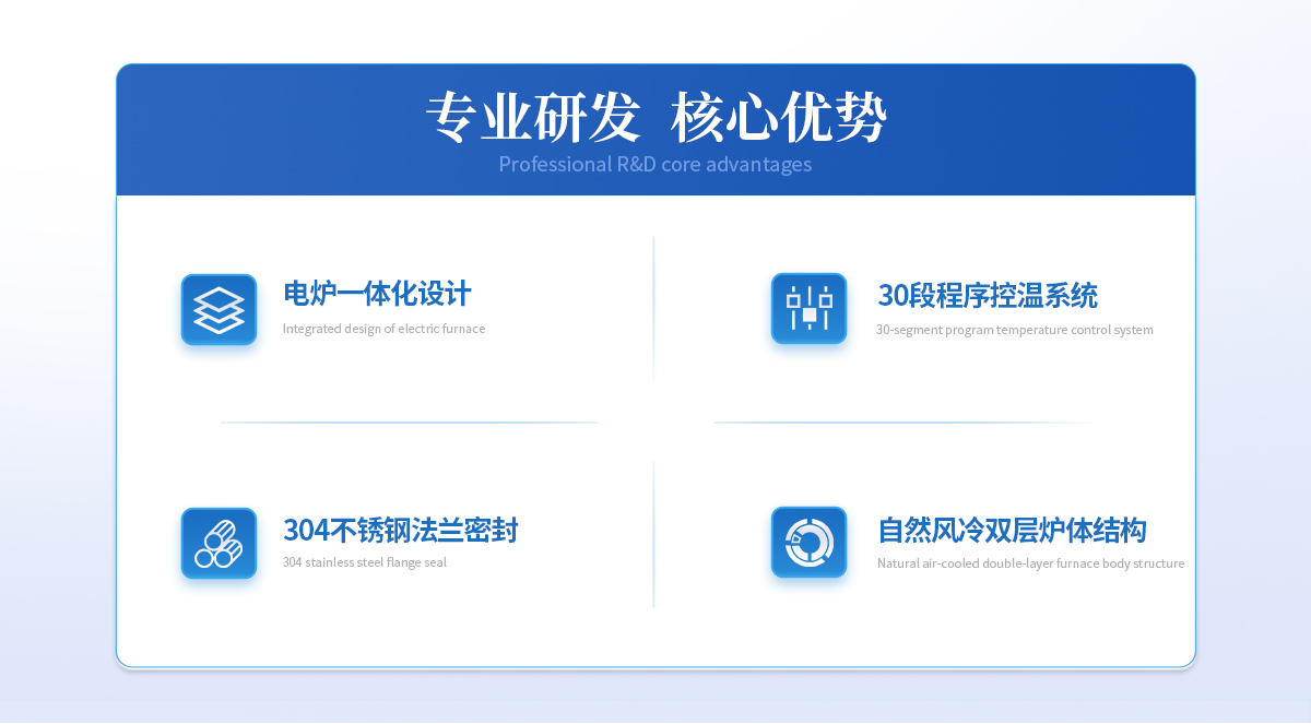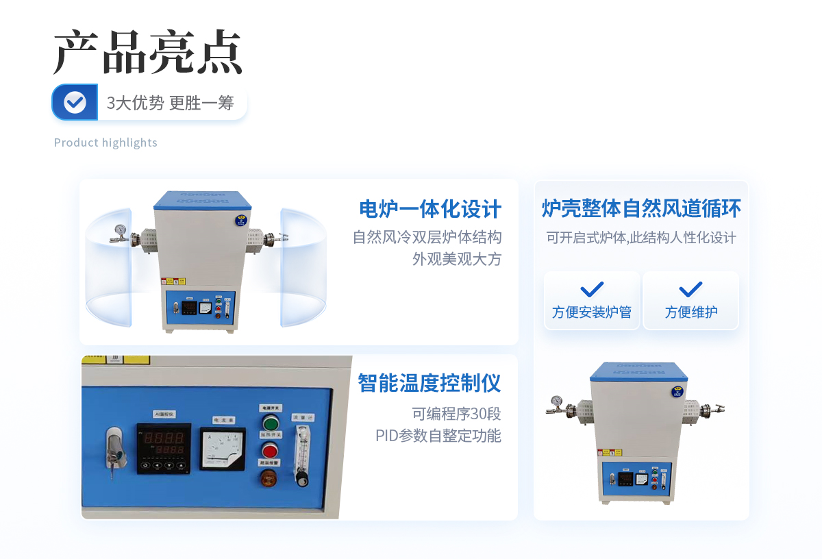 | 1、炉膛采用优质氧化铝纤维材料,保温性能好,耐用,拉伸强度高,无杂球,纯度高,节能效果明显; | 2、加热元件采用优质HRE电阻丝,大大提高了其使用寿命; | 3、超温报警,漏电保护,操作安全可靠。 |