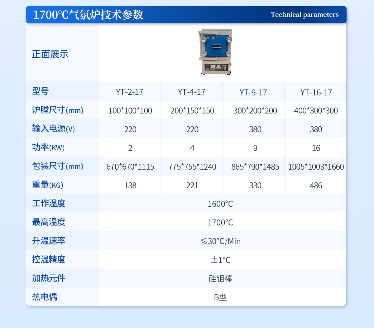 | 工作温度:1600℃ | **温度:1700℃ | 升温速率:≤30℃/Min | 控温精度:±1℃ | 加热元件:硅钼棒 | 热电偶:B型 | 工作电压:220V 50hz | 功率:2Kw |