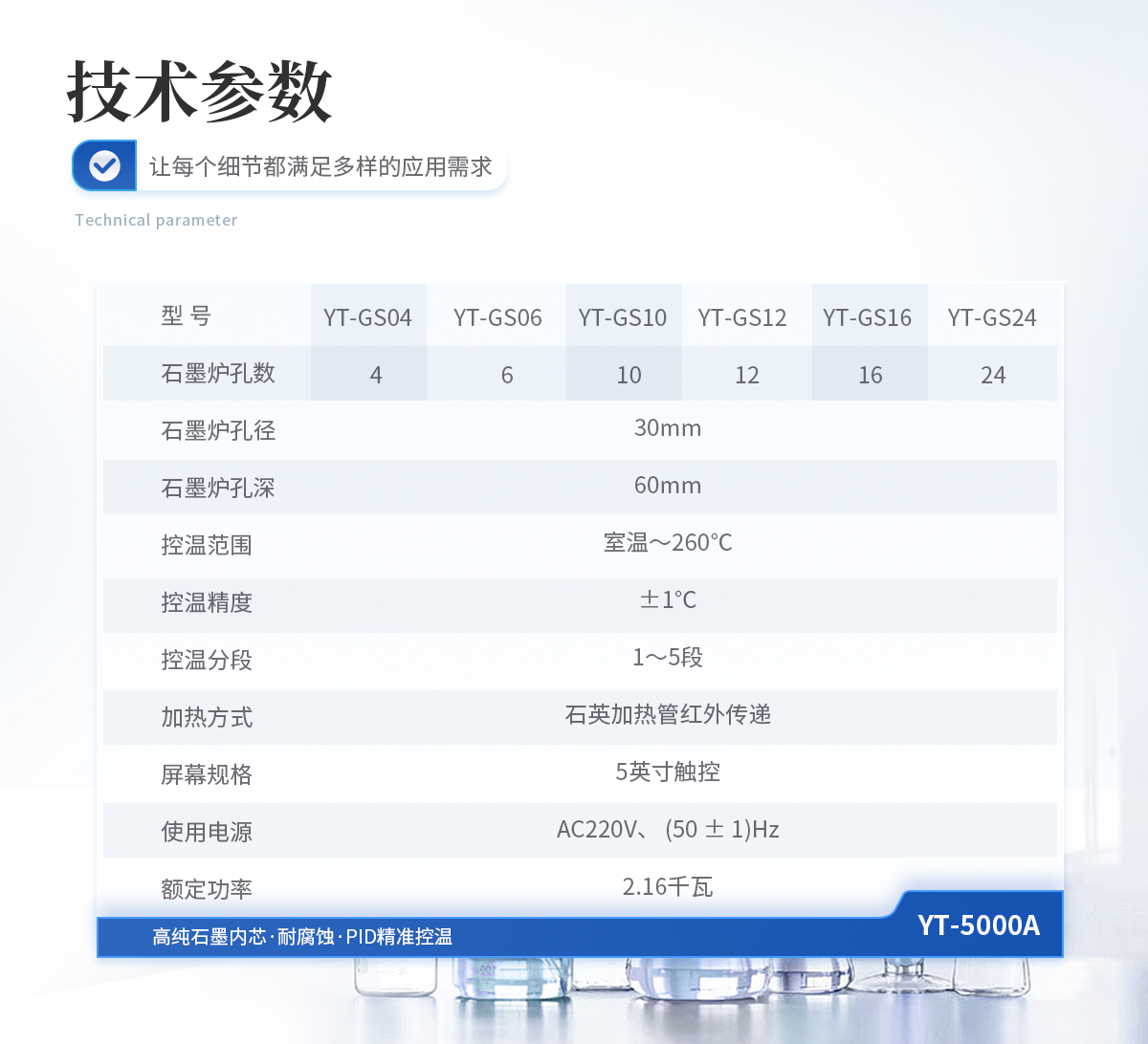 | 石墨炉孔:孔径30mm,孔深60mm,孔数5×2 | 控温范围:室温~260℃ | 控温精度:±1℃ | 控温分段:1~5段 | 加热方式:石英加热管红外传递 | 屏幕规格:5寸触控 | 主机外型尺寸:宽522mm×深371mm×高168mm | 使用电源:AC220V、 (50 ± 1)Hz | 额定功率:1.6千瓦 |