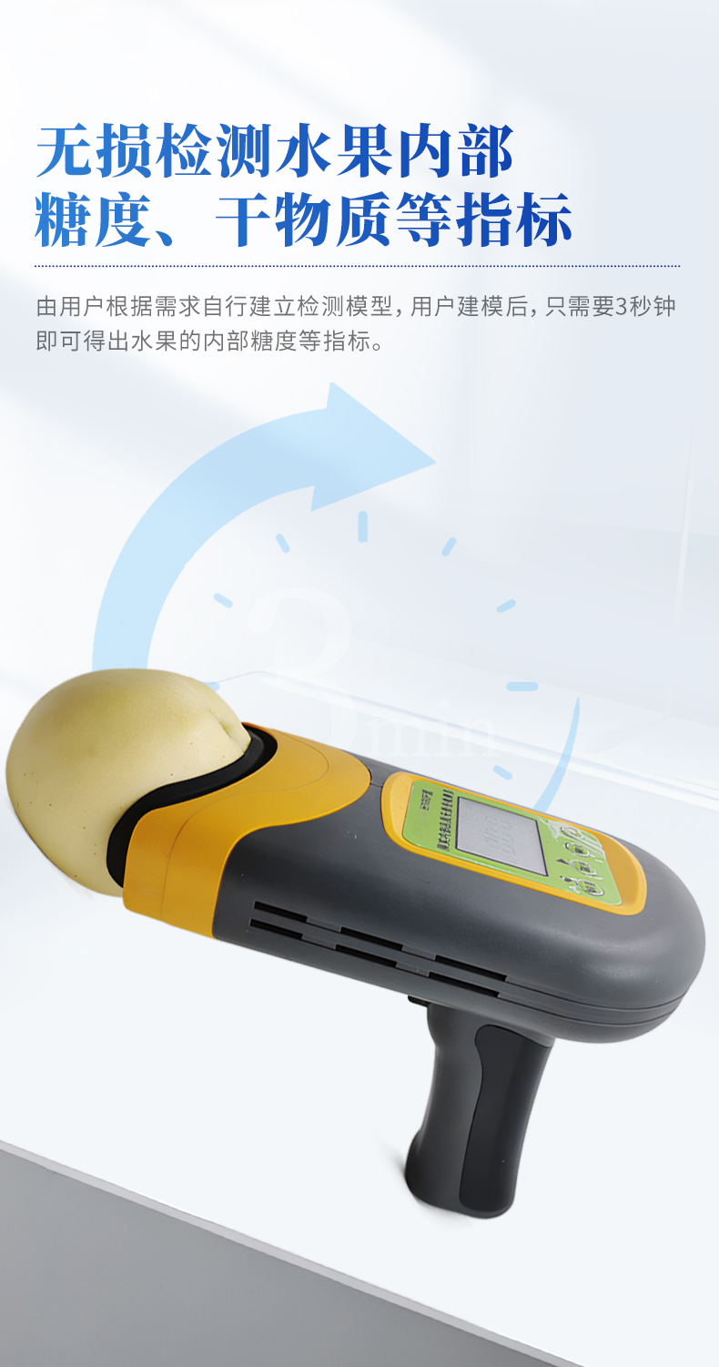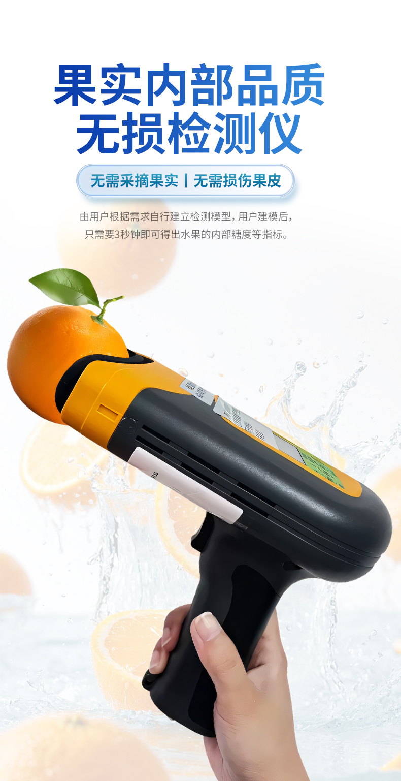 果实内部品质无损检测仪,使用近红外光谱分析原理, 对果实内部成分含 量进行预测。仪器由近红外光谱仪、光源、处理器、显示屏等组成。仪器光源发出近红外光,使果实内部的分子振动并发生能级跃迁,进而产生近红外光谱,因为近红外光谱和果实品质方面的成分含量具有相关性(如糖度、干物质等),可通过数学算法建立相关品质信息的预测模型,因此,在预测未知的水果样品时,只需要使用无损检测仪去扫描它,获取它的光谱信息,即可通过模型提供该水果样品的品质预测结果。