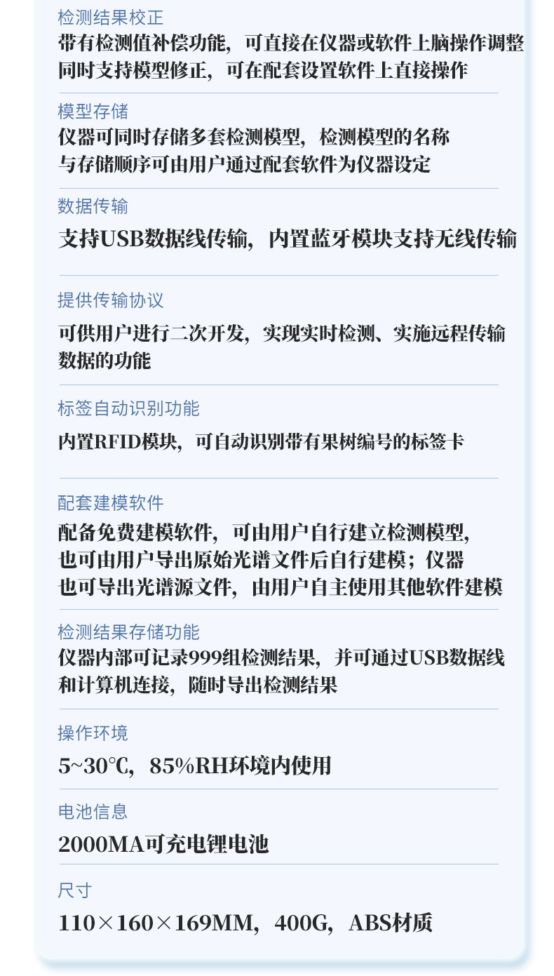 | 1.检测波长:650~950nm; | 2.光源:2个卤素灯; | 3.检测方式:漫反射式; | 4.可检测水果:根据以下选型表选择 | 5.适配水果大小(果径):H100F型(40-120mm),H100C型(30-80mm),H100M型(瓜类) | 6.检测项目: a.糖度(可溶性固形物SSC) b.干物质 c.水分 备注:实际可检测项目随果品种类不同而有区别 | 7.检测时间:3秒显示结果; | 8.电源:充满电后可连续检测2000次,附带直流12V/3A充电器; | 9.精度:糖度检测精度±0.5%,干物质检测精度±0.5%,具体表现由果品特性和建模效果决定; | 10.检测结果校正:带有检测值补偿功能,可直接在仪器或软件上脑操作调整;同时支持模型修正,可在配套设置软件上直接操作; | 11.模型存储:仪器可同时存储多套检测模型,检测模型的名称与存储顺序可由用户通过配套软件为仪器设定; | 12.数据传输:支持USB数据线传输,内置蓝牙模块支持无线传输; | 13.手机/移动终端传输功能:可将仪器检测的结果实时传输到配套的手机APP并进行存储,可在手机上导出存储的所有检测结果,仪器配套的手机APP为免费使用; | 14.提供传输协议,可供用户进行二次开发,实现实时检测、实施远程传输数据的功能; | 15.标签自动识别功能:内置RFID模块,可自动识别带有果树编号的标签卡; | 16.支持光谱信息存储和导出; | 17.配套建模软件:配备免费建模软件,可由用户自行建立检测模型,也可由用户导出原始光谱文件后自行建模;仪器也可导出光谱源文件,由用户自主使用其他软件建模; | 18.检测结果存储功能:仪器内部可记录999组检测结果,并可通过USB数据线和计算机连接,随时导出检测结果; | 19.操作环境:5~30℃,85%RH环境内使用 | 20.显示屏:LCD液晶屏 | 21.电池信息:2000mA可充电锂电池 | 22.尺寸:110×160×169mm,400g,ABS材质 | 23.附件:橡胶遮光罩,充电器,USB数据线,便携箱,软件(免费电子版) |