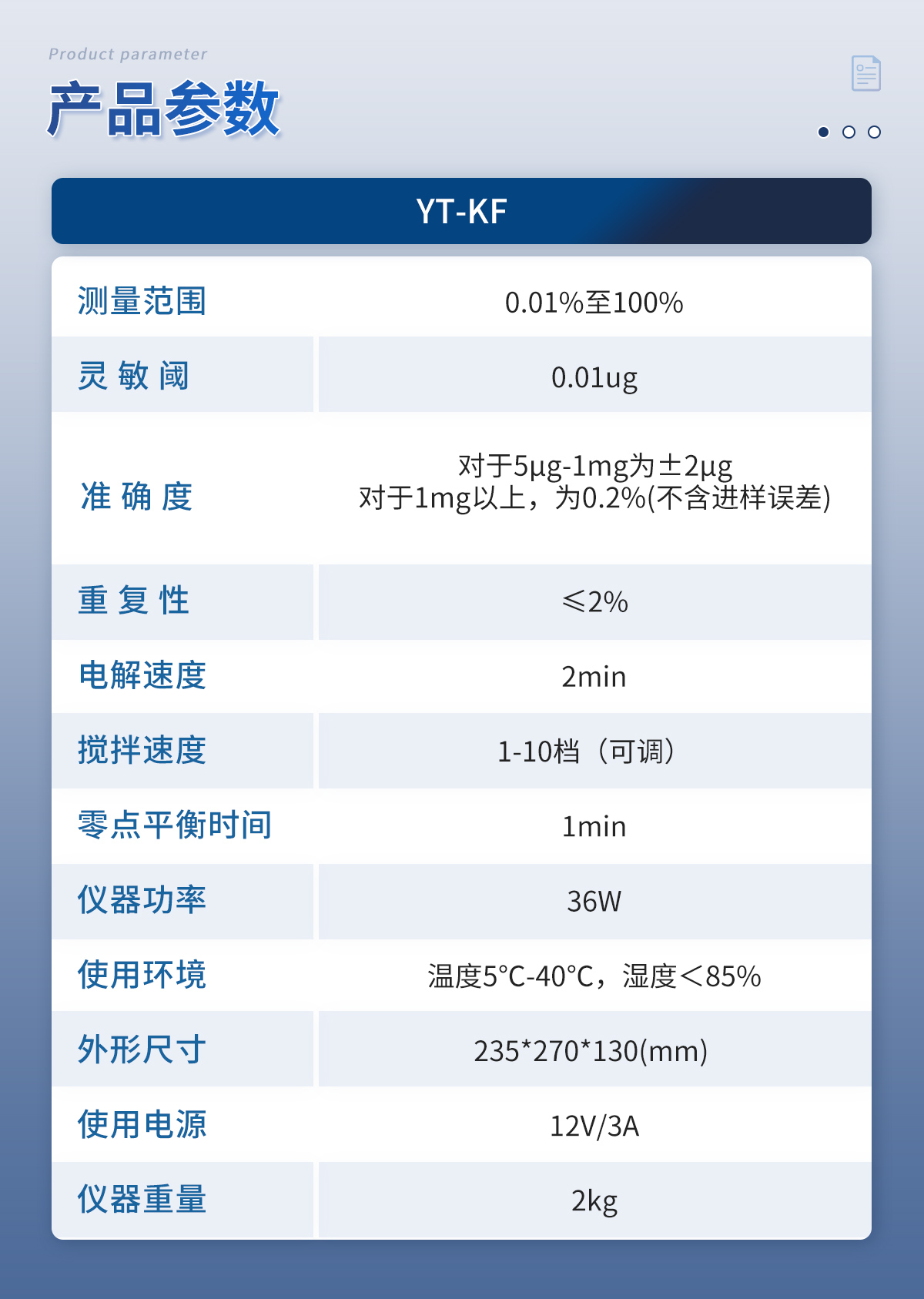 | 1.测量范围:0.01%至100% | 2.灵 敏 阈:0.01ug | 3.准 确 度:对于5μg-1mg为±2μg,对于1mg以上,为0.2%(不含进样误差) | 4.重 复 性:≤2% | 5.电解速度:2min | 6.搅拌速度:1-10档(可调) | 7.零点平衡时间:1min | 8.仪器功率:36W | 9.使用环境:温度5℃-40℃,湿度<85% | 10.外形尺寸:235*270*130(mm) | 11.使用电源:12V/3A | 12.仪器重量:2kg |
