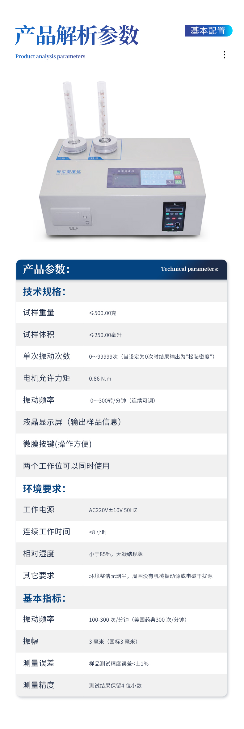 | 试样重量:≤500.00克; | 试样体积:≤250.00毫升; | 单次振动次数:0~99999次(当设定为0次时结果输出为"松装密度"); | 电机允许力矩:0.86 N.m; | 振动频率: 0~300转/分钟(连续可调); | 液晶显示屏(输出样品信息); | 微膜按键(操作方便) | 两个工作位可以同时使用 | 振动幅度:3mm,(可调) | ZS2高精度振实密度仪是专门针对固体粉体密度的测量仪器,按照****GB/T 5162-2006/ISO3953:1993,参照美国药典标准研发制造。广泛应用于工业、电池材料、药品材料、奶制品、磨料、造纸、水泥、涂料、科研机构、大中专院校以及各种金属和非金属行业。 |