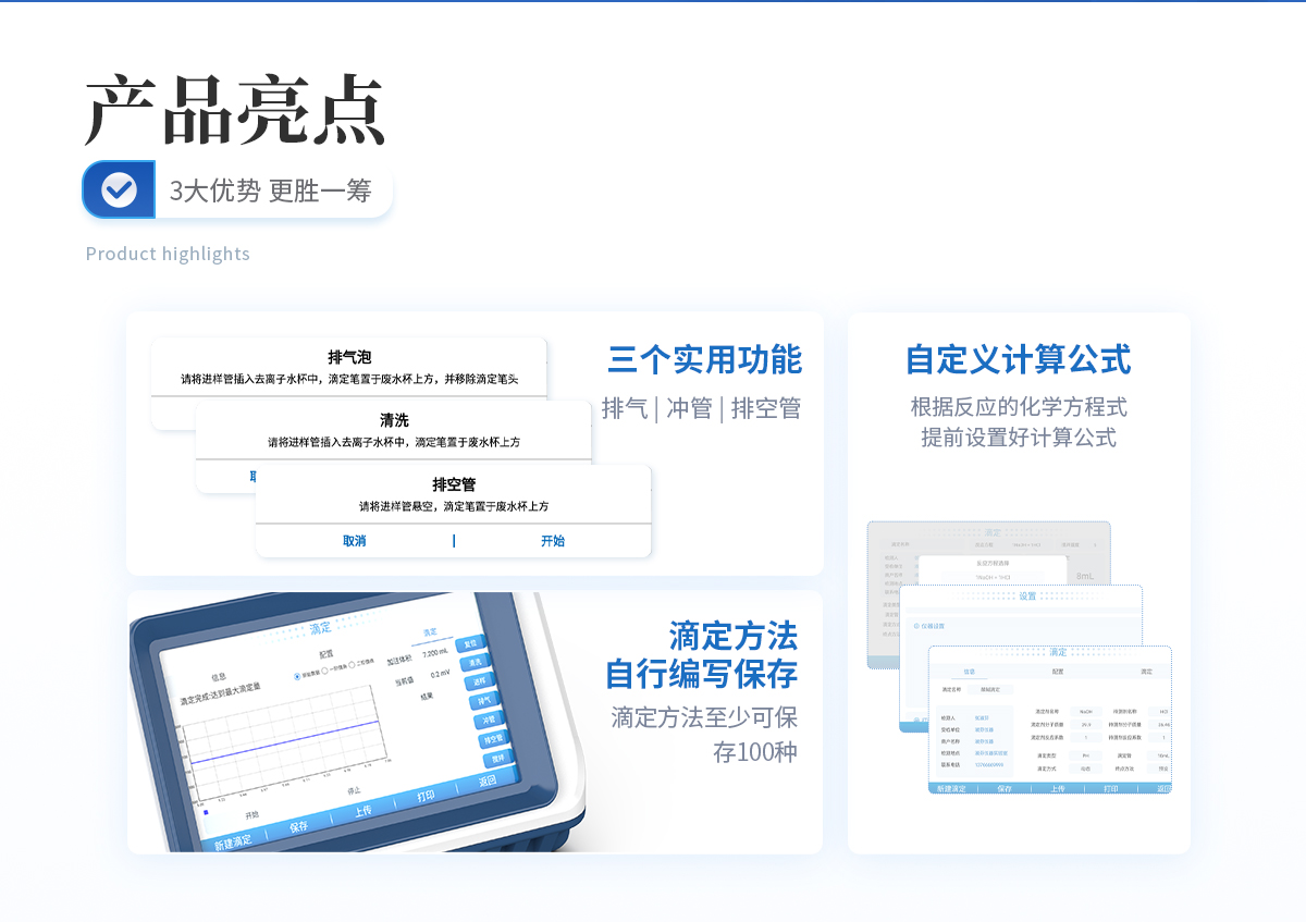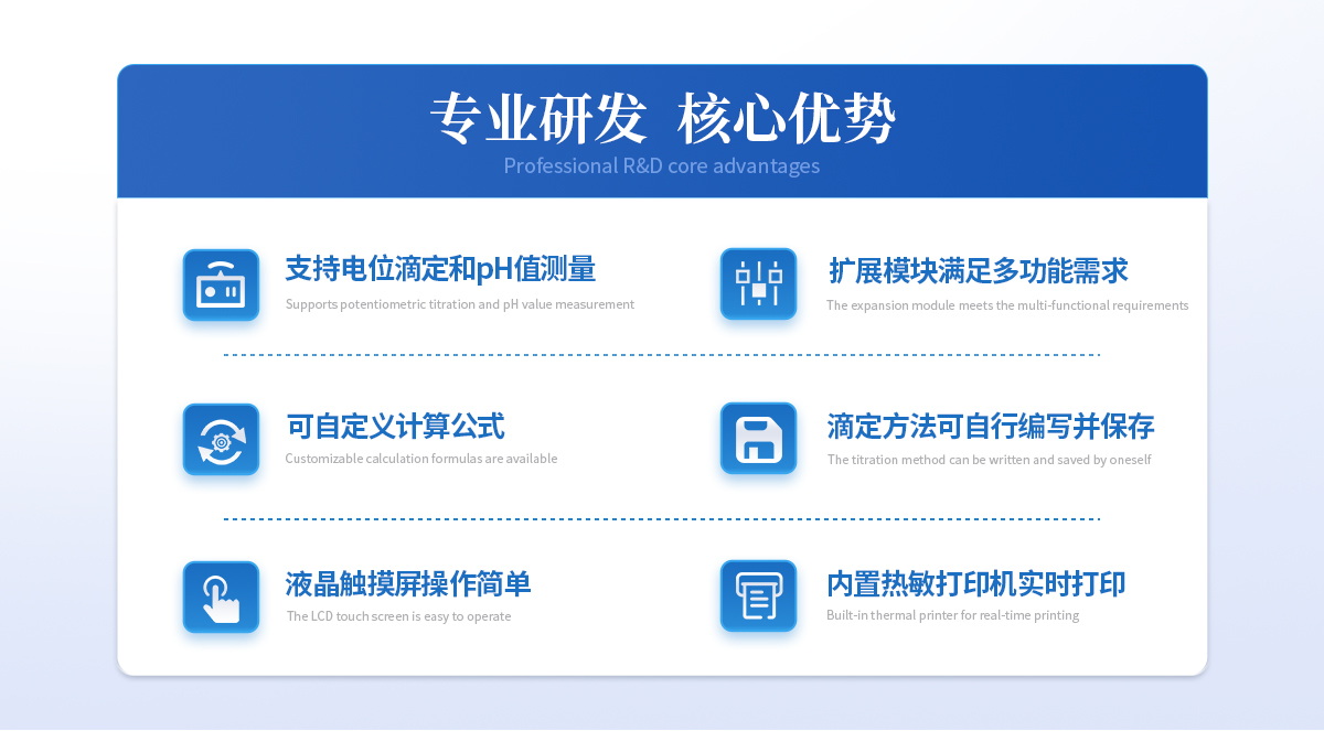 | 1、设备支持电位滴定和pH值测量;用户选择不同电极可进行酸碱滴定、氧化还原滴定、沉淀滴定、络合滴定等多种滴定和pH测量; | 2、用户可选配电导滴定、永停滴定等扩展模块,满足用户多功能需求; | 3、设备对****中采用的电位滴定法均满足,用户可根据检测需求选择适配的电极即可; | 4、支持动态滴定、等量滴定、手动滴定的滴定方式,可预设滴定终点或自动识别终点滴定,方便用户根据样品特性选择**滴定工作流程; | 5、可自定义计算公式,根据反应的化学方程式提前设置好计算公式,滴定完成后将自动获得待测物含量; | 6、滴定方法可自行编写并保存,形成滴定方法快捷模式,在使用时可直接选择运行,滴定方法至少可保存100种; | 7、设备可作为实验室常规手动滴定的滴定装置使用;计量泵替代滴定管,磁力搅拌功能替代手动摇晃锥形瓶的工作; | 8、仪器实用的三个功能: (1)排气,可将滴定管或管路内的气泡排出,避免气泡带来的滴定误差; (2)冲管,可以*少的试剂消耗量使管路内充满试剂,实现节省试剂的同时减少试剂混合引入的滴定误差; (3)排空管,可在实验完成后将管路中的液体收集到滴定管内,避免在拆卸管路时产生药液溅洒问题。 |