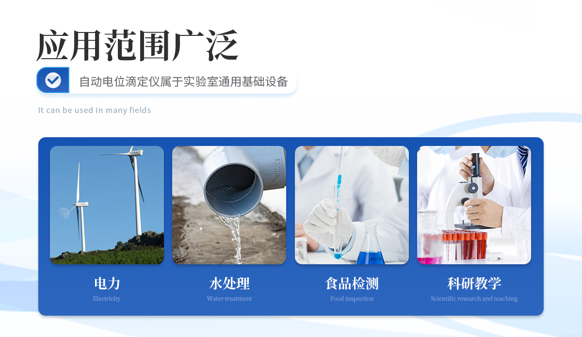 | 自动电位滴定仪属于实验室通用基础设备,使用非常广泛,可应用在食品、药检、疾控、商检、水处理、石油、化工、海洋、电力、环保、新能源、教学、科研等相关领域。 |