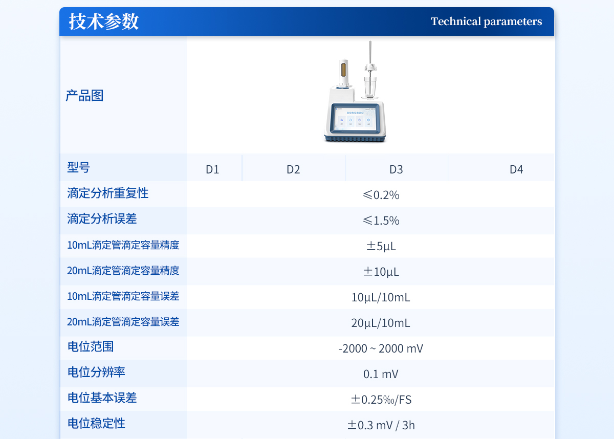 | 自动电位滴定仪是一种用于化学分析的精密仪器,他通过自动添加滴定剂来确定样品中特定成分的浓度。该仪器基于电位滴定原理工作,即根据在滴定过程中电池电动势的变化来确定滴定终点的一款滴定设备。设备满足国家检定规程JJG 814-2015《自动电位滴定仪》仪器级别中的0.05级别,即仪器**示值误差为±1.5%,仪器示值重复性≤0.2% |