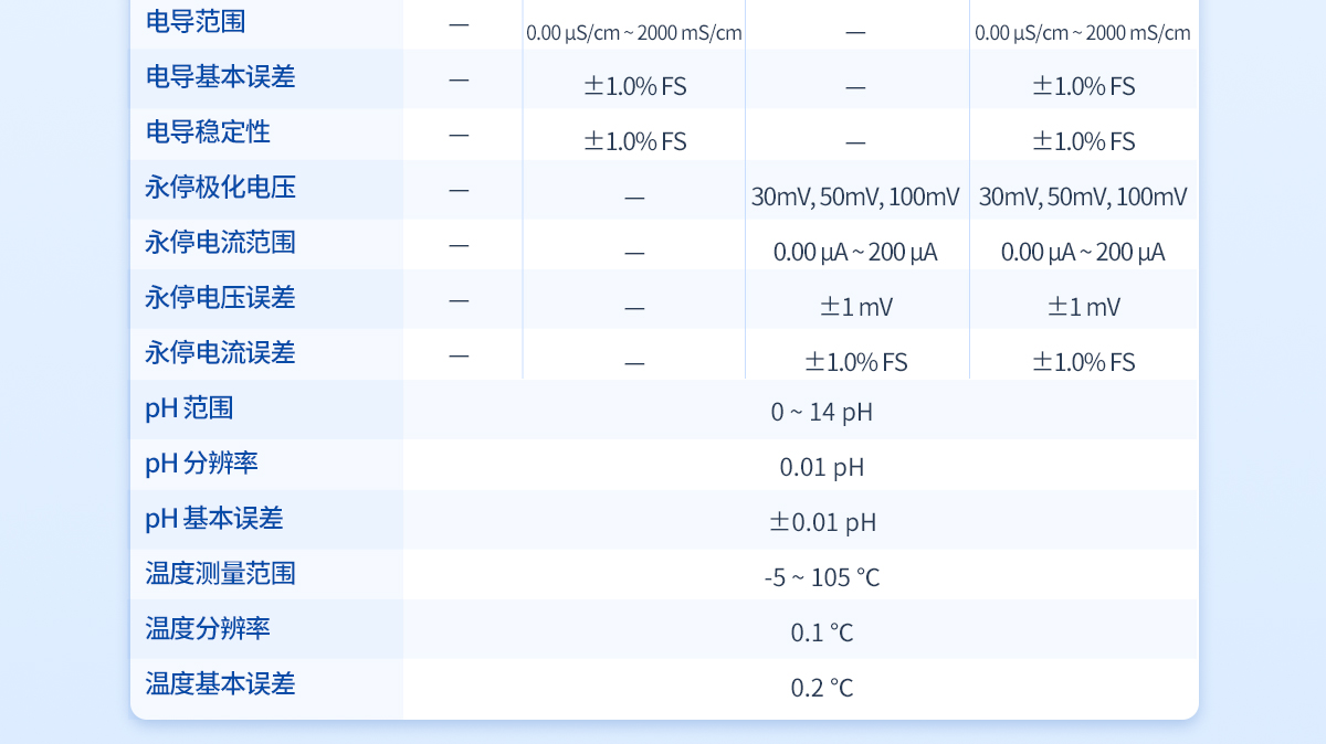 | 滴定分析重复性:≤0.2% | 滴定分析误差:≤1.5% | 10mL滴定管滴定容量精度:±5μL | 20mL滴定管滴定容量精度:±10μL | 10mL滴定管滴定容量误差:10μL/10mL | 20mL滴定管滴定容量误差:20μL/10mL | 电位范围:-2000—2000mV | 电位分辨率:0.1mV | 电位基本误差mV:±0.25‰/FS | 电位稳定性mV:±0.3mV/3h | pH范围:0-14PH | pH分辨率:0.01PH | 温度测量范围:-5 - 105℃ | 温度分辨率:0.1℃ | 温度基本误差:0.2℃ |