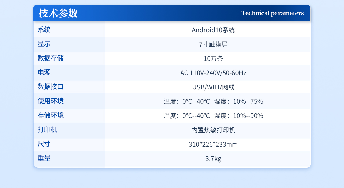 | 系统:Android10系统 | 显示:7寸触摸屏 | 数据存储:10万条 | 电源:AC 110V-240V/50-60Hz | 数据接口:USB/WIFI/网线 | 使用环境:温度:0℃--40℃ 湿度:10%--75% | 存储环境:温度:0℃--40℃ 湿度:10%--90% | 打印机:内置热敏打印机 | 尺寸:310*226*233mm | 重量:3.7kg |